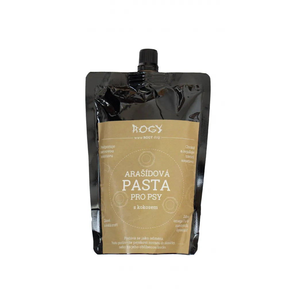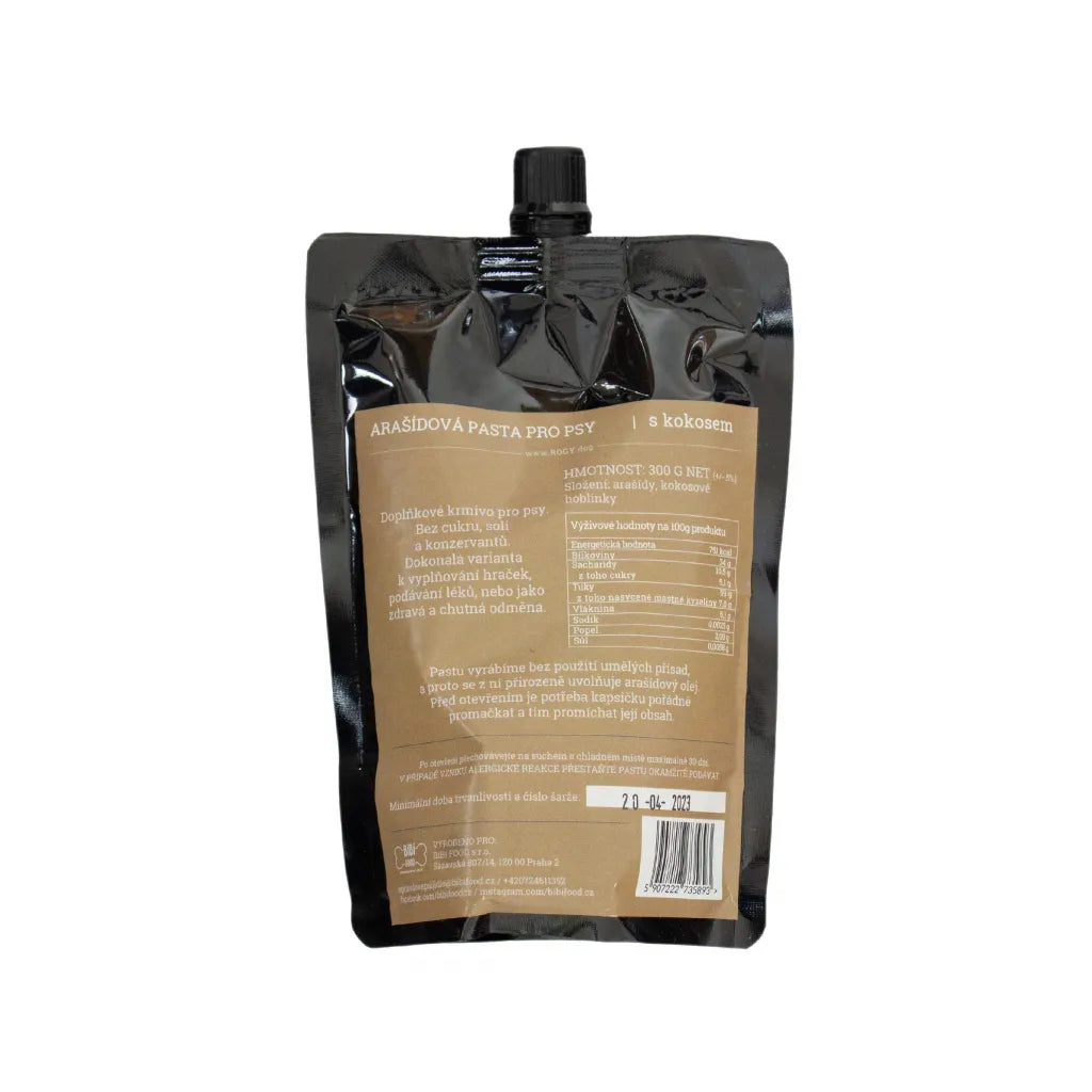 The paste is packaged in a practical package with a cap that facilitates dosing. It is made by grinding peanuts and is a healthy snack for dogs. Coconut flakes added to the paste contain high amounts of vitamins, minerals and fiber and are rich in antioxidants that support the immune system.