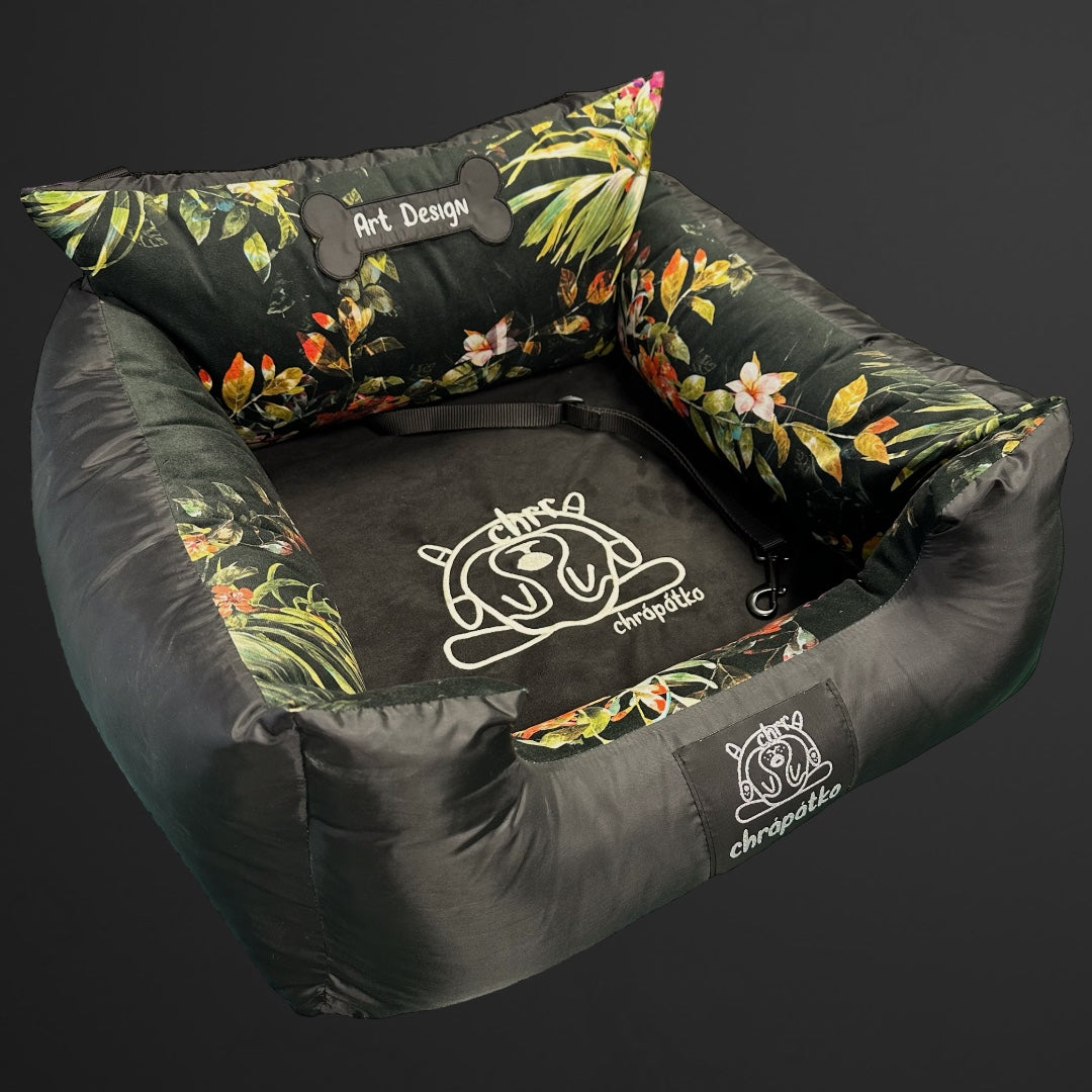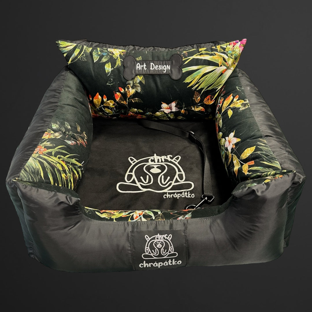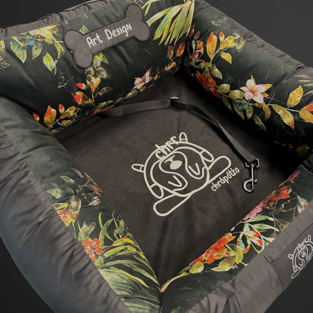 Premium car seat for dogs. Interior design made of very luxurious printed durable fabric.