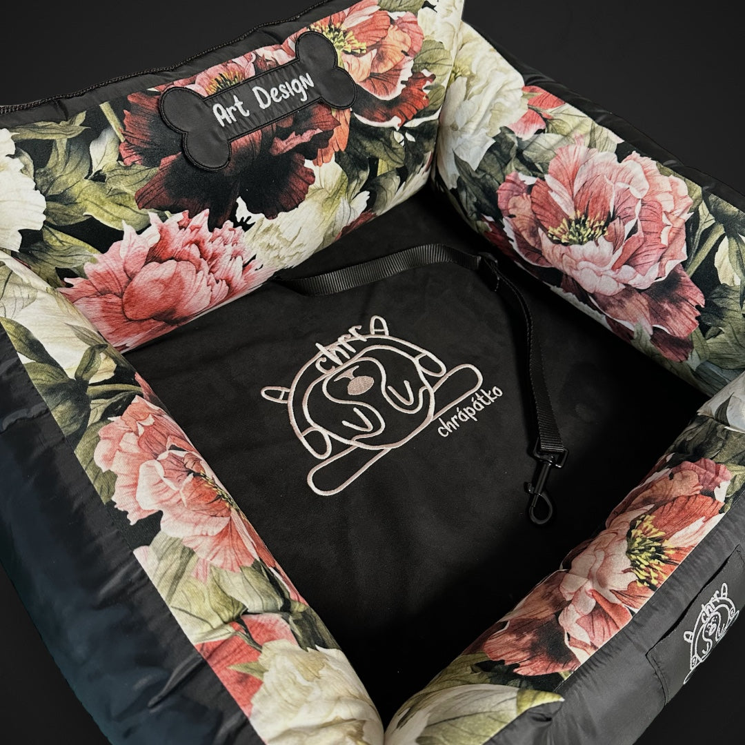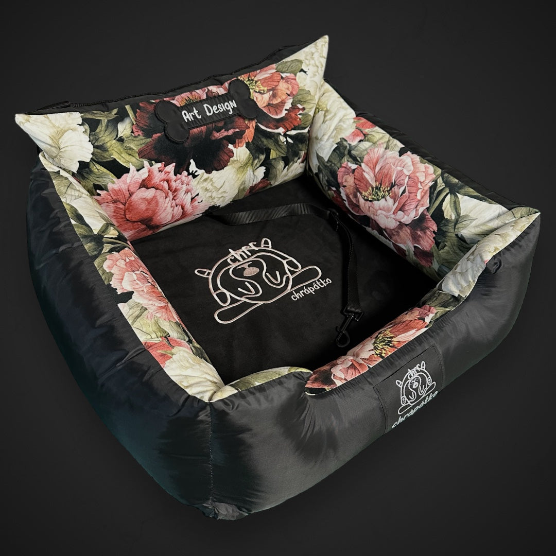 Premium car seat for dogs. Interior design made of very luxurious printed durable fabric.
