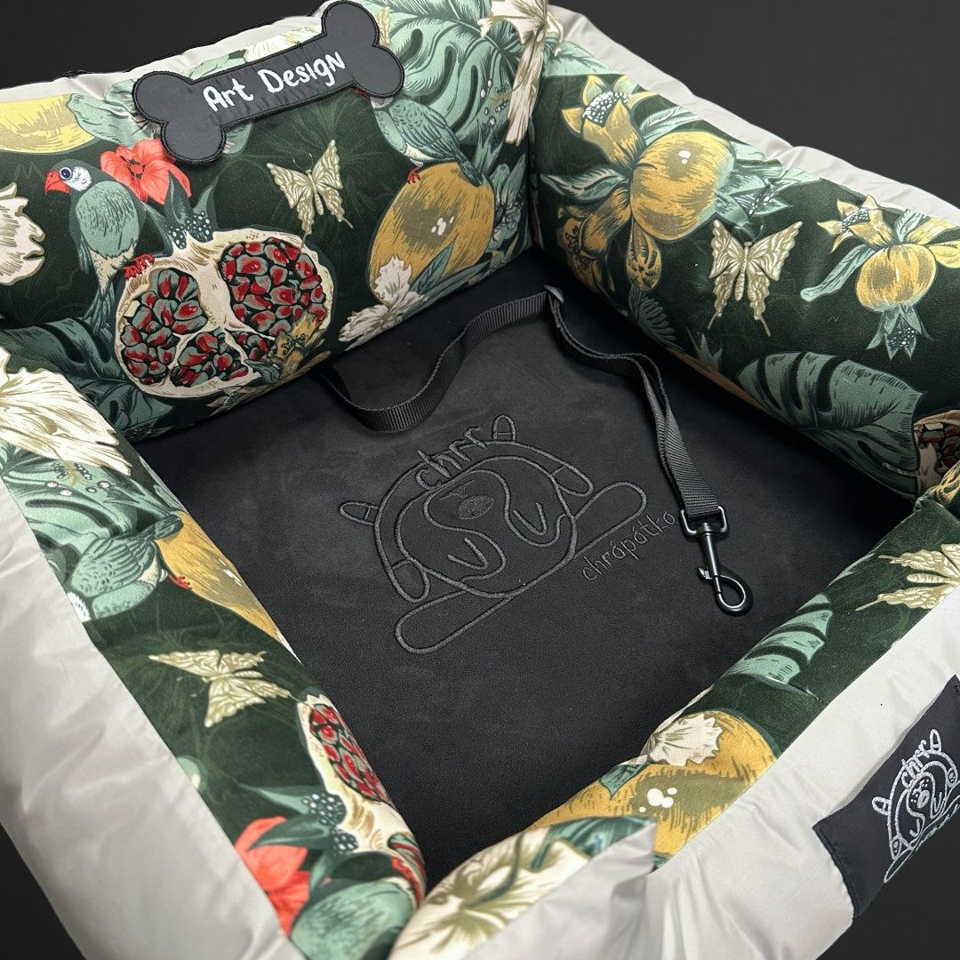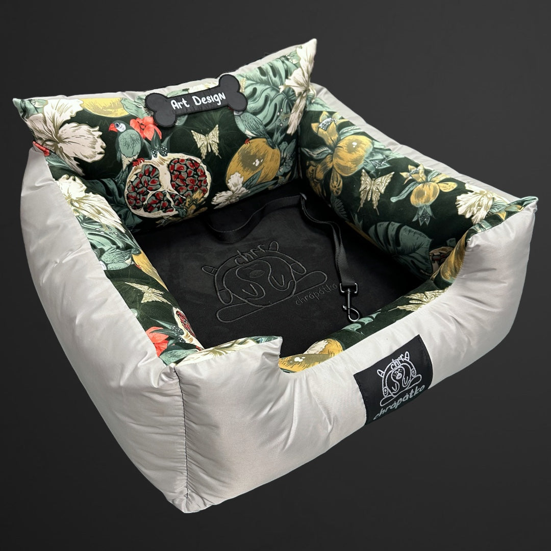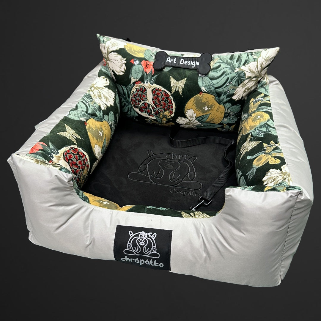Premium car seat for dogs. Interior design made of very luxurious printed durable fabric.