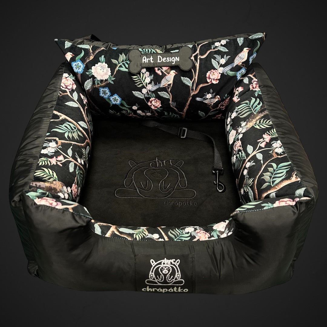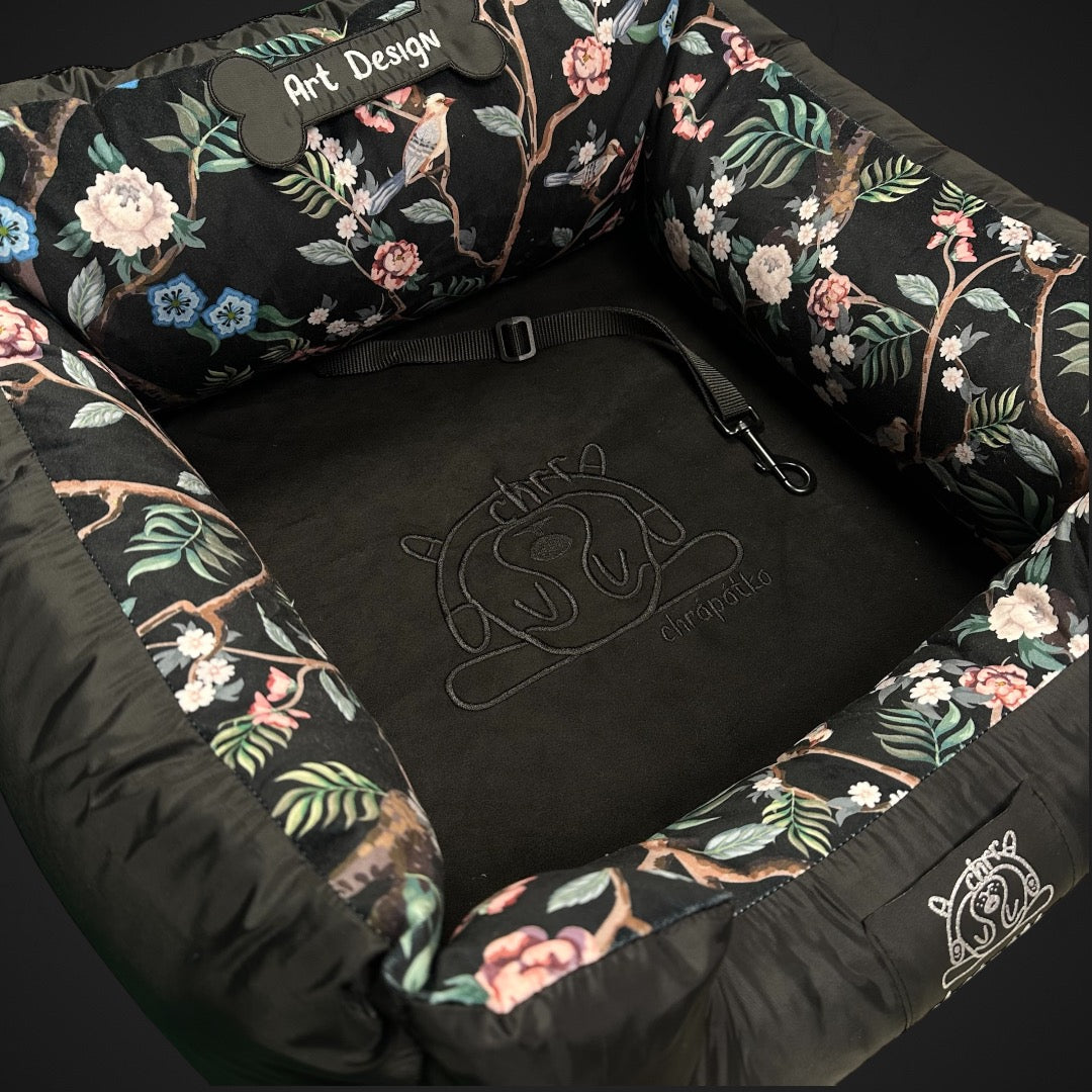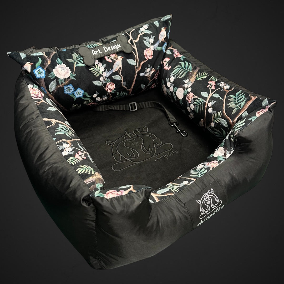 Premium car seat for dogs. Interior design made of very luxurious printed durable fabric.