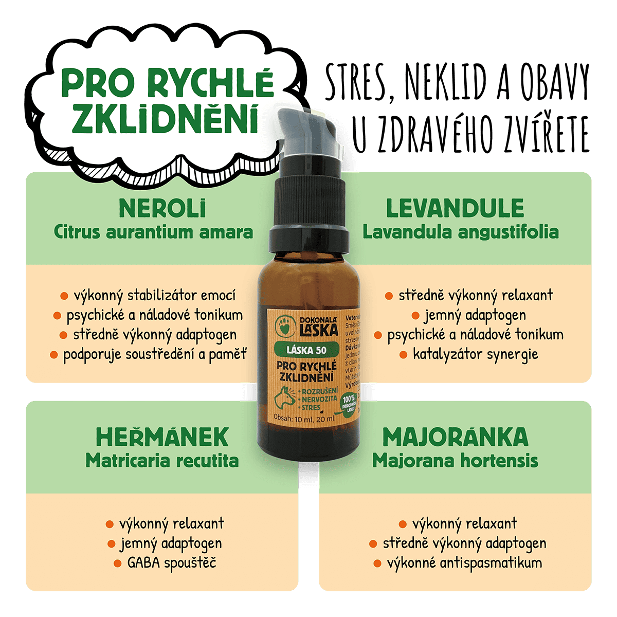 Normal stressful situations can usually be handled by a healthy animal without problems due to its ability to adapt and the support of the owner. However, there are times when even a healthy animal needs additional help, especially if the situation is too demanding for him. In these cases, the all-natural preparation Láska 50 Pro can help to quickly calm down.