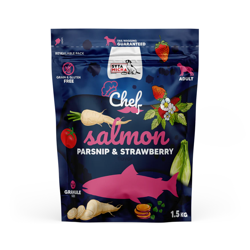 Syta Micha Salmon, Parsnip and Strawberry is a complete grain-free food for adult dogs of all breeds.