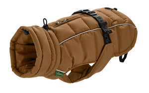 Kabátek je vyroben z nepromokavého materiálu a má měkkou, hřejivou výplň, která chrání psa i v mrazivém počasí. Vysoký nastavitelný límec a krytí břicha brání pronikání chladu a větru, zatímco reflexní prvky zajišťují lepší viditelnost ve tmě nebo za zhoršené viditelnosti.