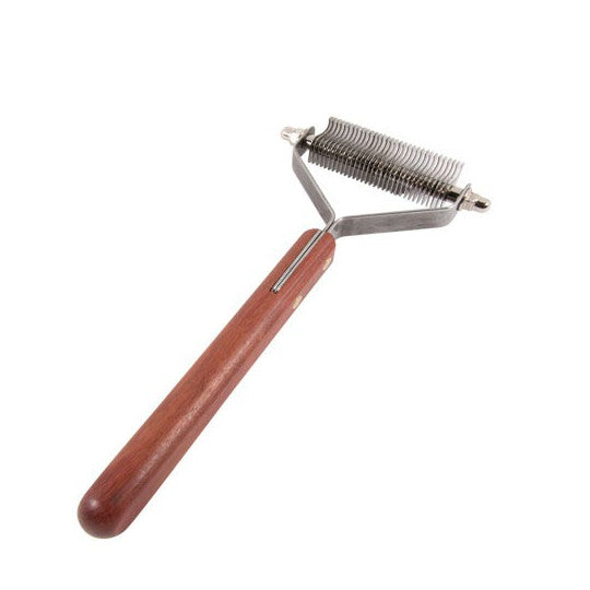 Kvalitní dřevěná rukojeť s ergonomickým tvarem dobře sedí v ruce a zajišťuje pohodlí i při delším používání. Promyšlená konstrukce nástroje snižuje zatížení kloubů a přispívá k plynulé, efektivní a méně namáhavé úpravě srsti.