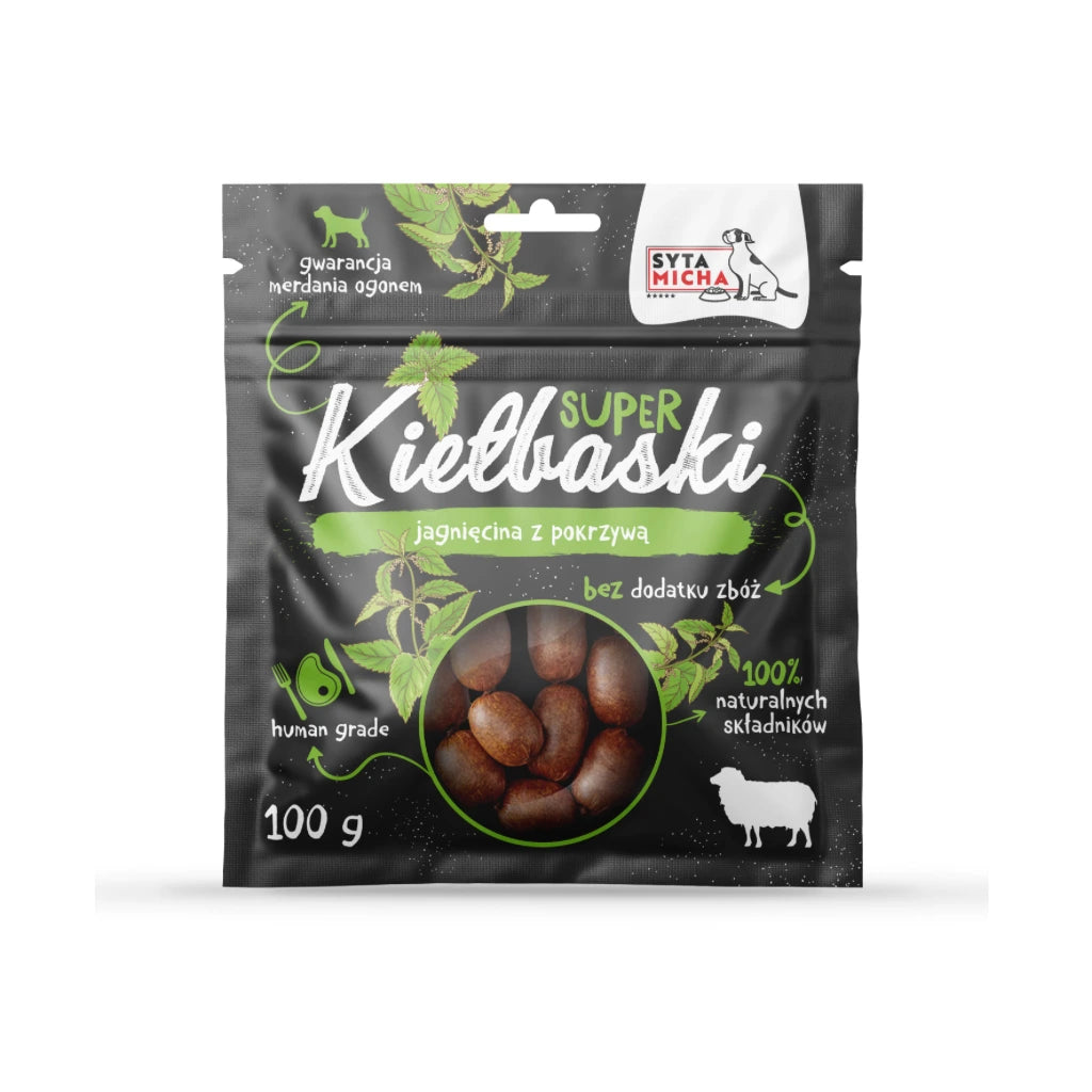 Lamb sausages for dogs are dried treats in the form of small sausages with a unique taste and tempting aroma. Thanks to their shape similar to human sausages, they are easy to portion. In addition to high-quality lamb meat, they also contain healthy nettles.