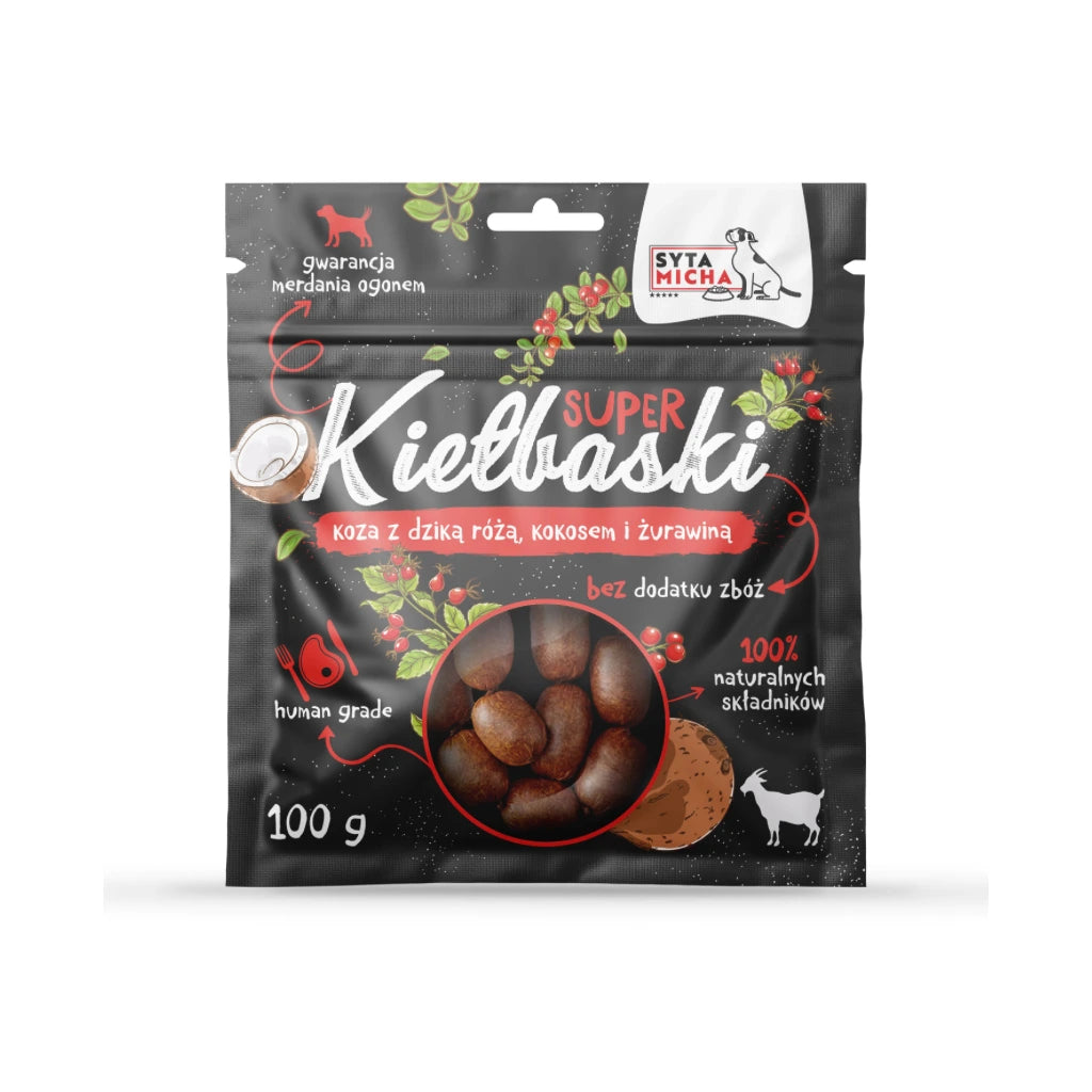 Goat sausages for dogs are dried treats in the form of small sausages with a unique taste and tempting aroma. Their shape, similar to human sausages, makes them easy to slice. In addition to high-quality goat meat, they also contain superfoods such as wild rose, cranberries and coconut.