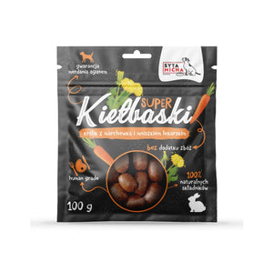 Rabbit sausages for dogs are dried treats in the form of small sausages with a unique taste and tempting aroma. Thanks to their shape, which resembles human sausages, they are easy to portion and contain not only high-quality meat, but also an excellent combination of carrot and dandelion.