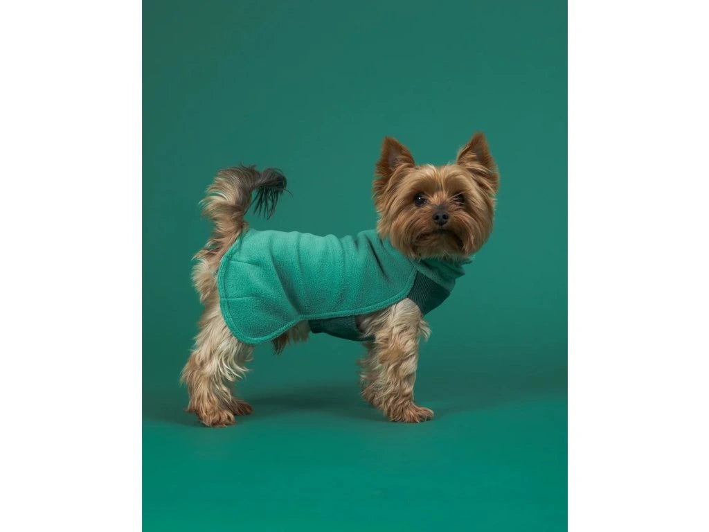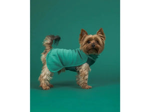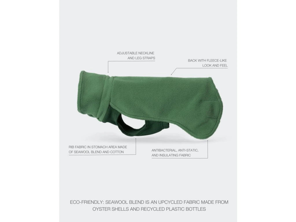 Materiál oblečku má antibakteriální a antistatické vlastnosti a zároveň výborně izoluje, takže pomáhá udržet psa v teple, komfortu a čistotě i při každodenním nošení. Zádová část je na pohled i na dotek hebká, s fleece strukturou, zatímco oblast bříška je vyrobena z kombinace Seawool a bavlny v jemně žebrovaném úpletu, který je pružný a velmi příjemný na nošení. Díky nastavitelným páskům v oblasti nohou a výstřihu lze tričko snadno přizpůsobit různým proporcím psa a zajistit tak ideální padnutí. Přírodní zelený odstín dodává oblečku nadčasový a elegantní vzhled.