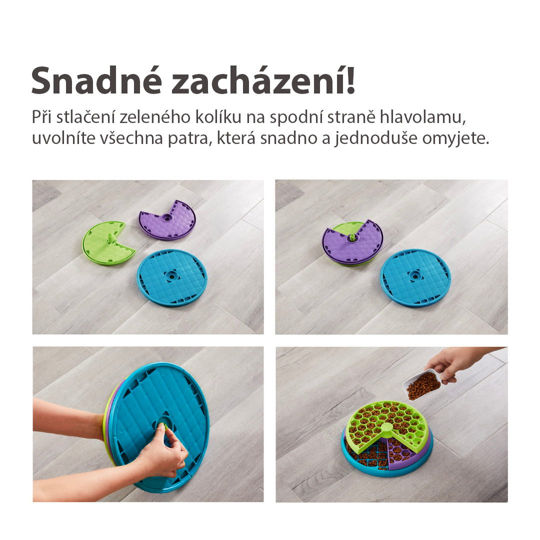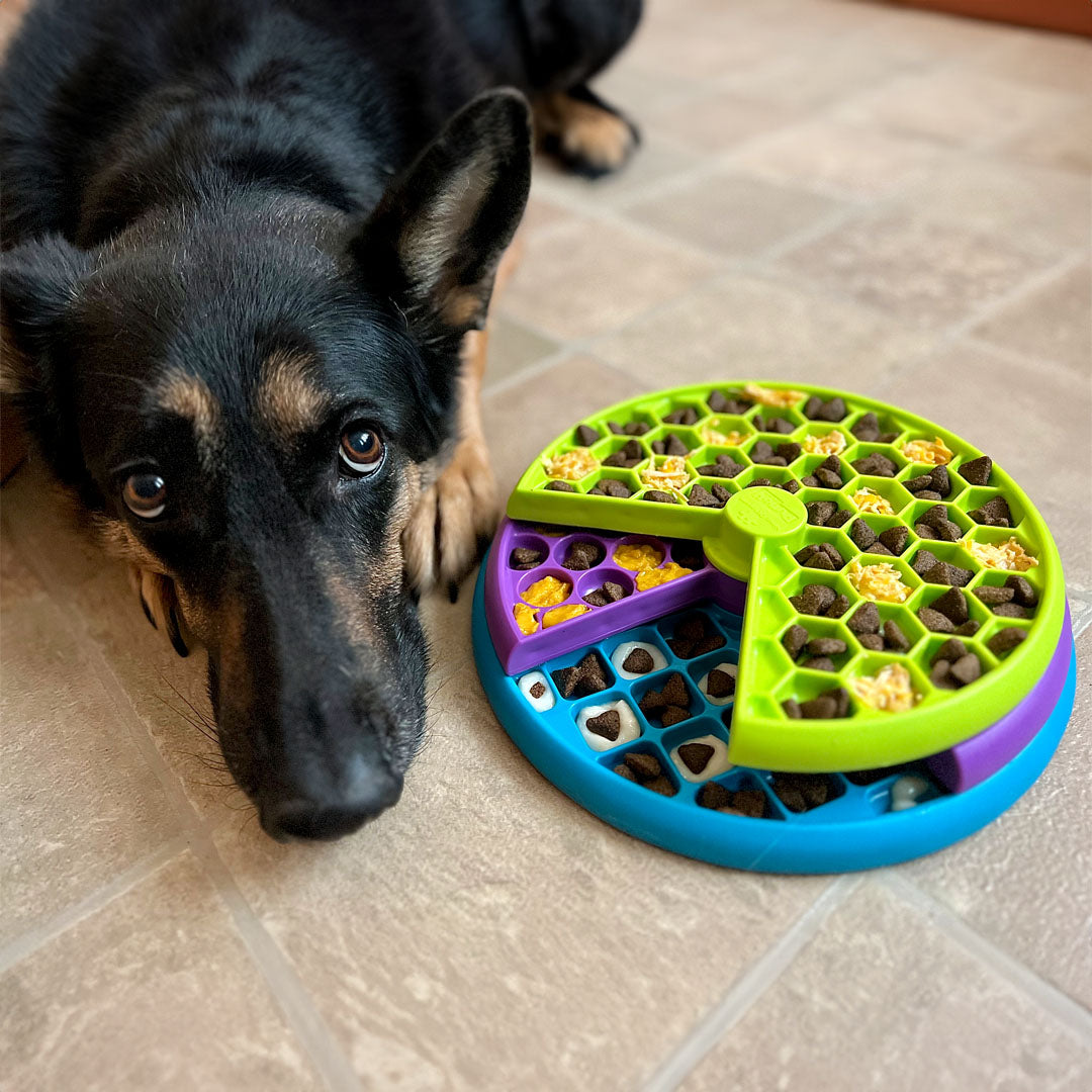 Nina Ottosson's puzzles stimulate your dog's brain. Cues, praise and repeated refills of treats will strengthen your bond together. Keep your dog under supervision throughout the game and do not let him chew the toy. Hide the puzzle until the next game.