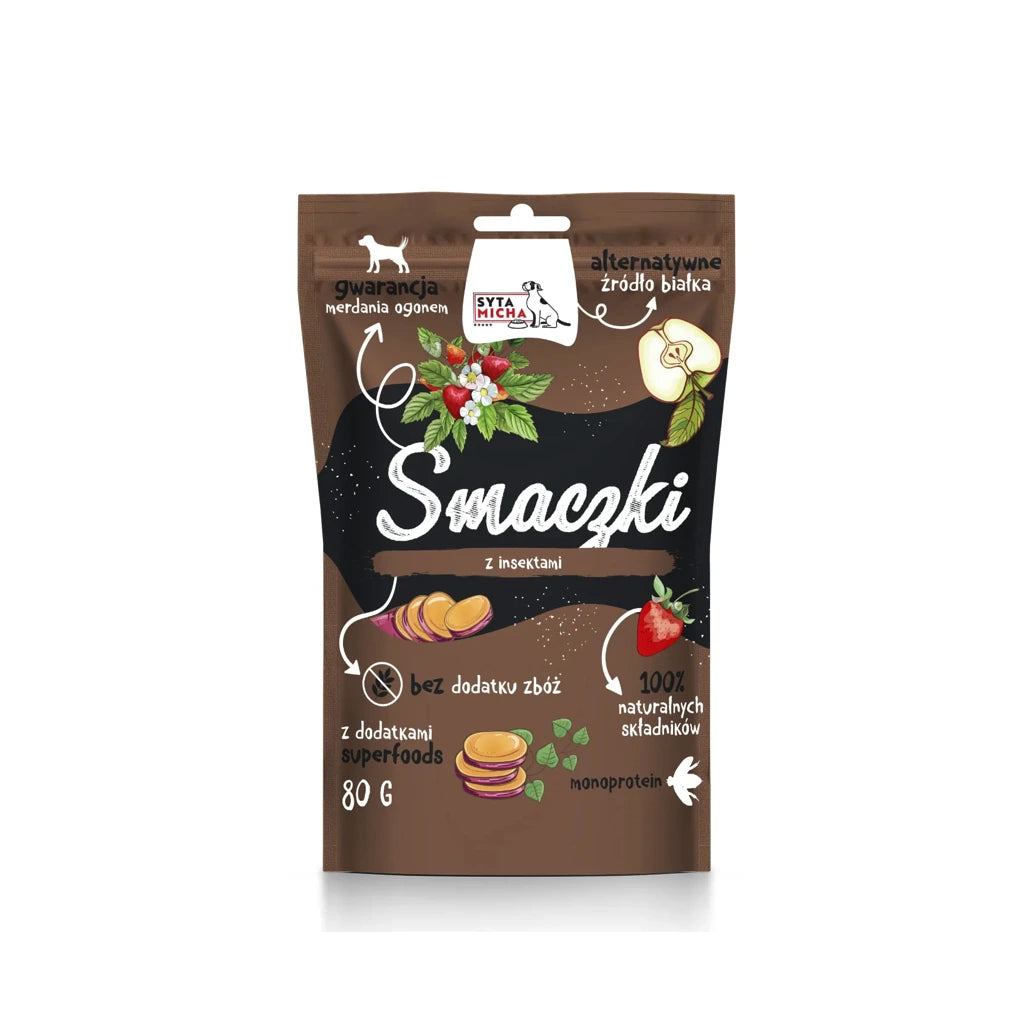 These are small-sized monoprotein snacks, the composition of which is based on proteins derived from black fly larvae (Hermetia illucens), not from ruminants. The package contains 80 g of treats.