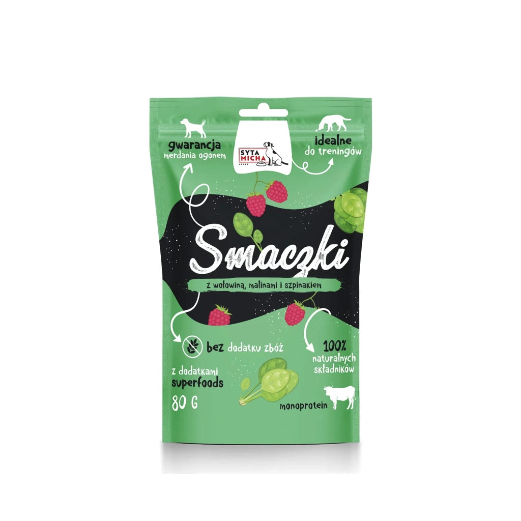 Meat treats with beef, raspberries and spinach are a healthy treat for dogs of all ages, including puppies, adult dogs and seniors. They contain no artificial ingredients or preservatives, and their small size is perfect for dogs of all sizes. The package contains 80 g of treats.