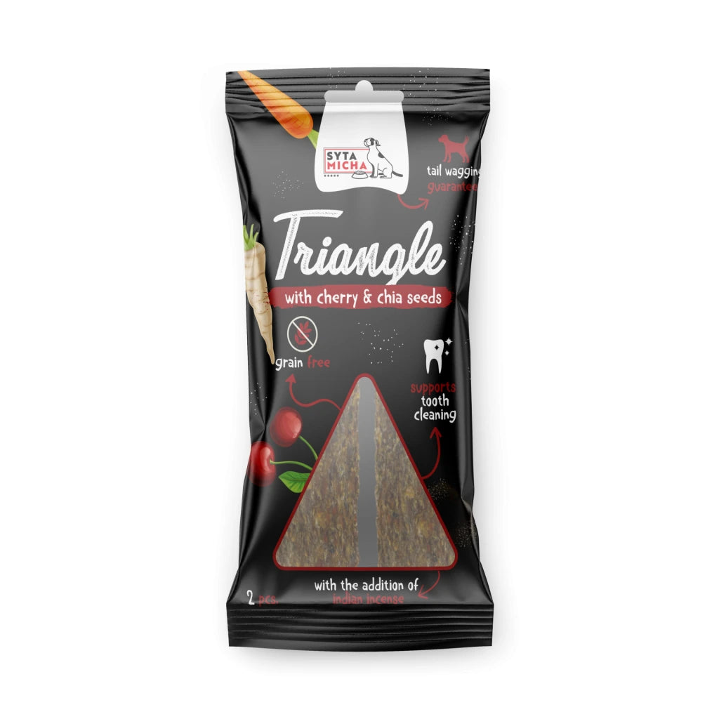 The triangle made of cowhide, with goat muscle, cherry and chia seeds from Syta Micha is a vitamin bomb with an innovative shape that your sweetheart will love! The natural superfood ingredients do an essential health service for your pet's body, and the texture of the treat cleans and massages his teeth and gums.
