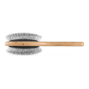 Bambusová obojstranná kefa pre psov, vhodná pre všetky typy srsti. Efektívne rozčesáva, odstraňuje uvoľnené chlpy a vyhladzuje srsť. Vďaka dlhým a pružným drôteným hrotom je ideálny na vyčesávanie spodnej vrstvy srsti. Obojstranný dizajn zaisťuje univerzálne použitie pre rôzne techniky vyčesávania.