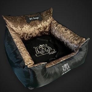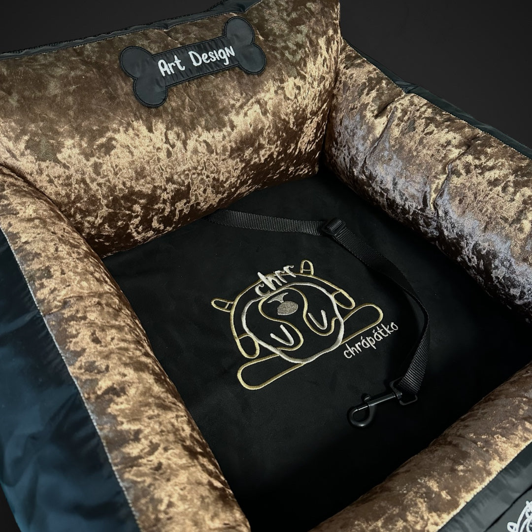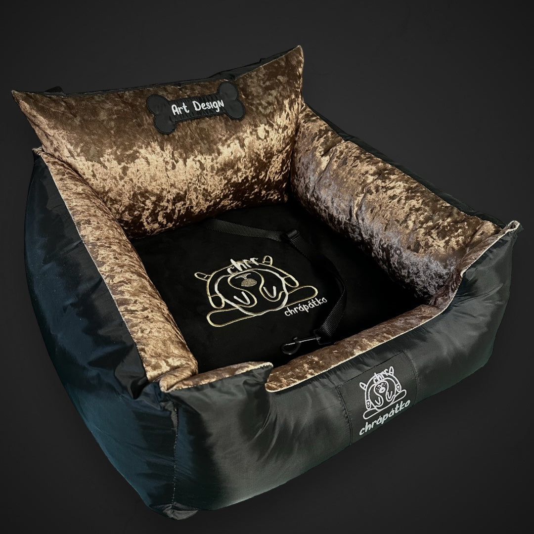 Prémiová autosedačka pre psov. Vnútorný dizajn z veľmi luxusnej potlačenej odolnej látky.