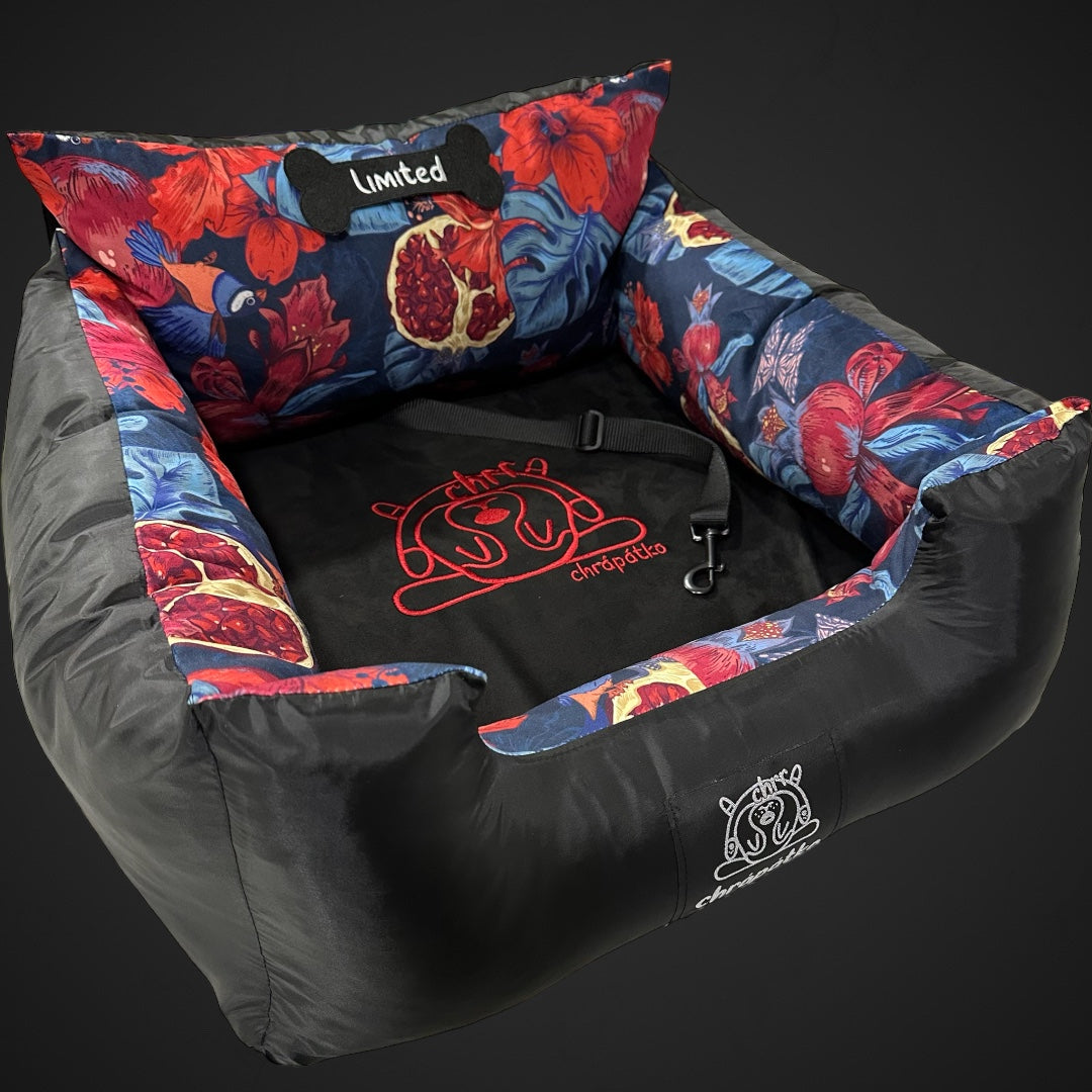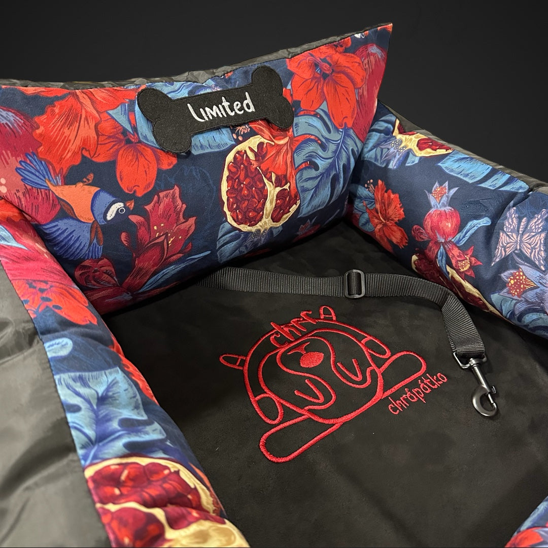 Prémiová autosedačka pre psov. Vnútorný dizajn z veľmi luxusnej potlačenej odolnej látky.