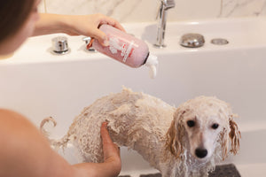 - Aplikácia šampónu : Naneste šampón na srsť, začnite pri labkách, pokračujte cez chrbát a krk.