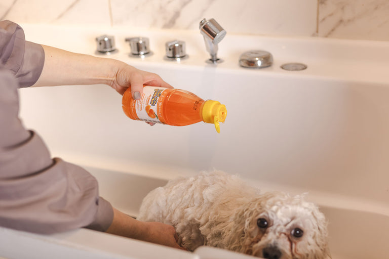 - Šampón narieďte v pomere 1:3 a jemne vmasírujte do srsti po celom tele.