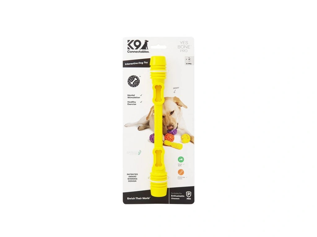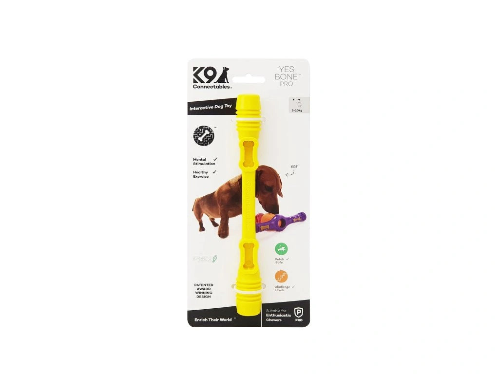 Yes Bone, rovnako ako ostatné hračky z radu PRO, je navrhnutá pre silných psov, ktorí potrebujú odolnú hračku. Napriek tomu však žiadna hračka nie je stopercentne nezničiteľná, preto odporúčame psa pri hre sledovať a hračku po hre schovať na ďalšie použitie. Kosť je určená predovšetkým na prepojenie s ďalšími K9 Connectables® hračkami, nie na samostatné žuvanie.