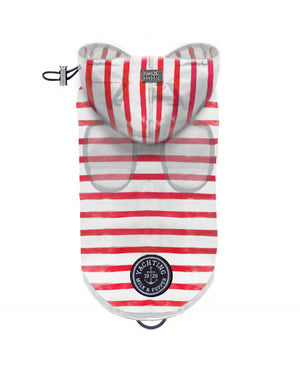 Průhledná elegance, která vynikne i za deštivého dne. Tato exkluzivní pláštěnka s červenými pruhy chrání vašeho pejska před deštěm a zároveň mu dodá šmrnc.