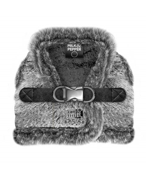 - Vyrobený z luxusnej fantazijnej šedo/čiernej kožušiny, ktorá dodáva sofistikovaný a moderný vzhľad.