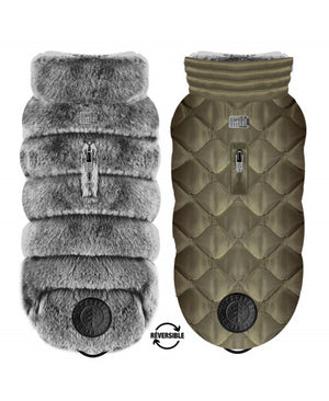 - strana jedna : veľmi jemná šedo/čierna fantasy kožušina - druhá strana : khaki prešívaný polyester (vodoodpudivý)