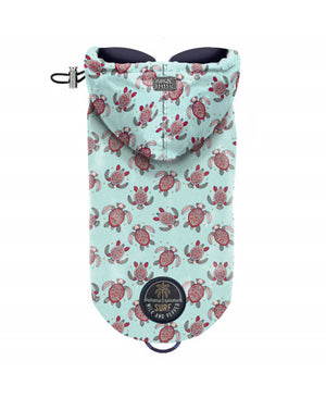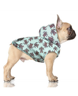 Udržte svého pejska suchého a spokojeného i v deštivém počasí! Tato bezrukávová pláštěnka je vyrobena ze světlě zeleného nepromokavého materiálu s exkluzivním potiskem želvy a podšitá tmavě modrým žerzejem.