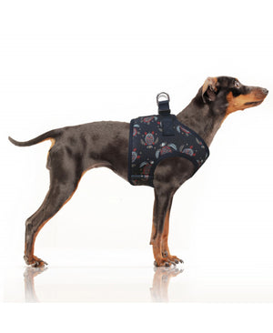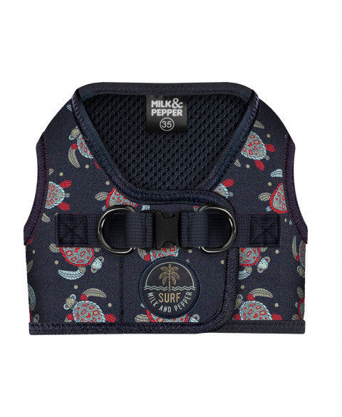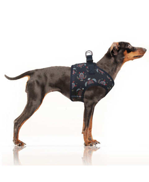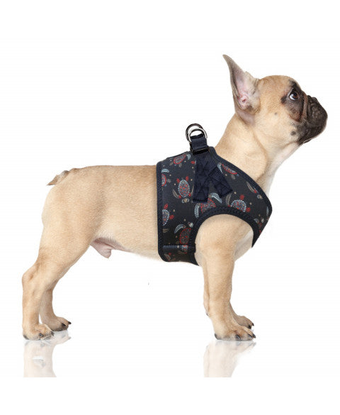 Moderní postroj v tmavě modrém provedení s originálním vícebarevným potiskem želv zaujme nejen svým vzhledem, ale i funkčním zpracováním. Je vyroben z kvalitního neoprenu, který je měkký, pružný a zároveň odolný. Díky tomu poskytuje psovi maximální komfort i při delších procházkách.