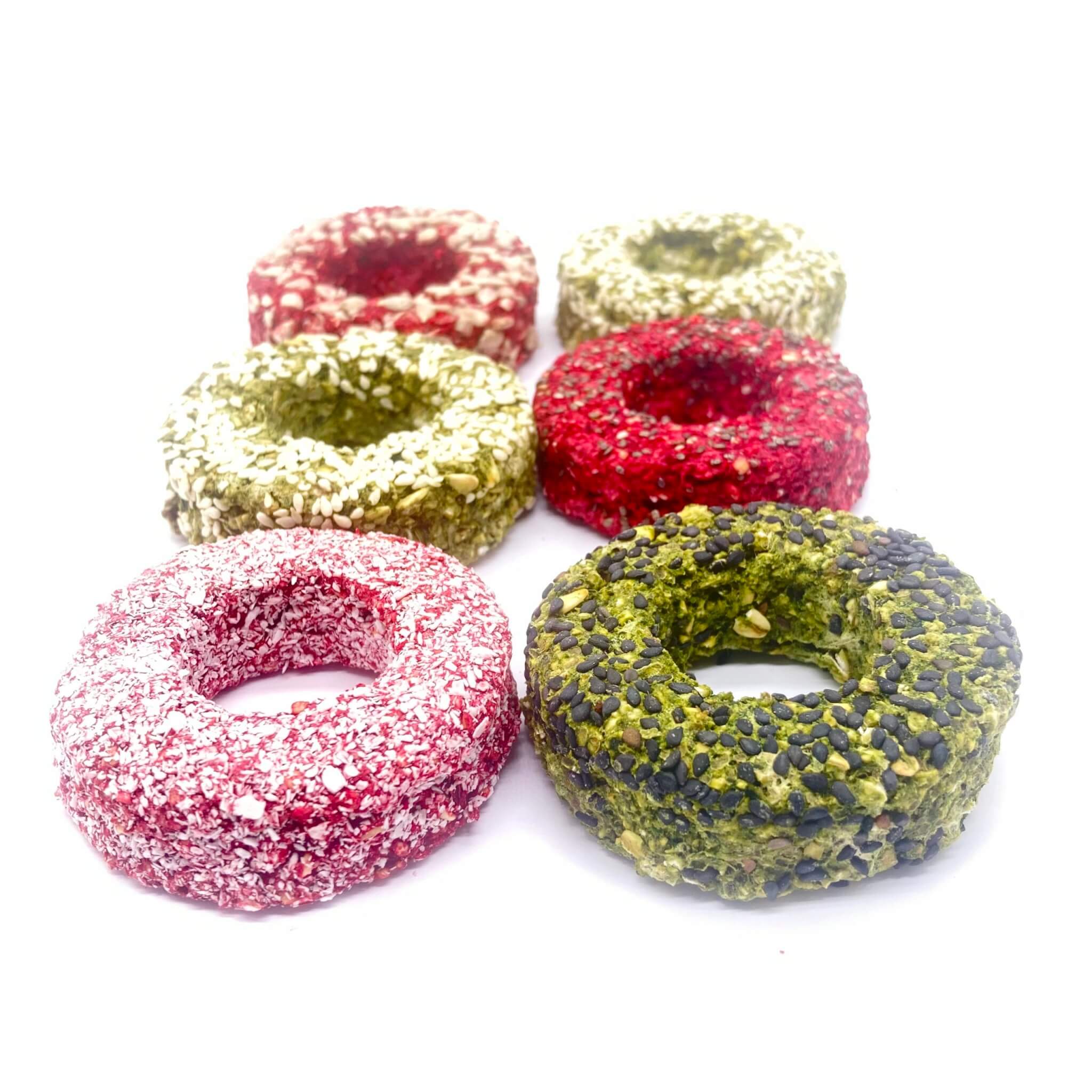 2.) 3 ks hovädzie donuty s repou (kokos, chia semienka, slnečnicové semienka), 3 ks hovädzie donuty so špenátom