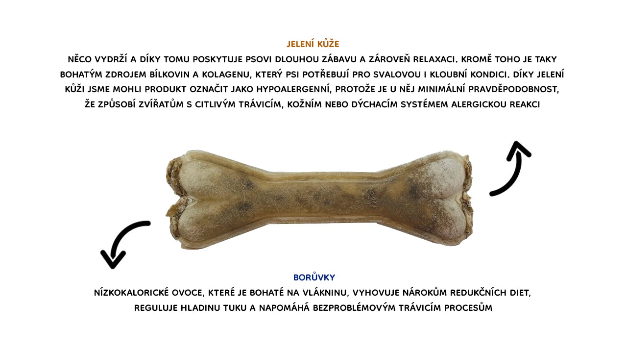 Vďaka tomu môžete aj štvornohým kamošom s citlivým bruškom dopriať poriadne pohryznutie nízkokalorickej jelenia kože s náplňou s čučoriedkami a uspokojiť tak ich prirodzené potreby.