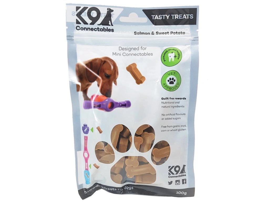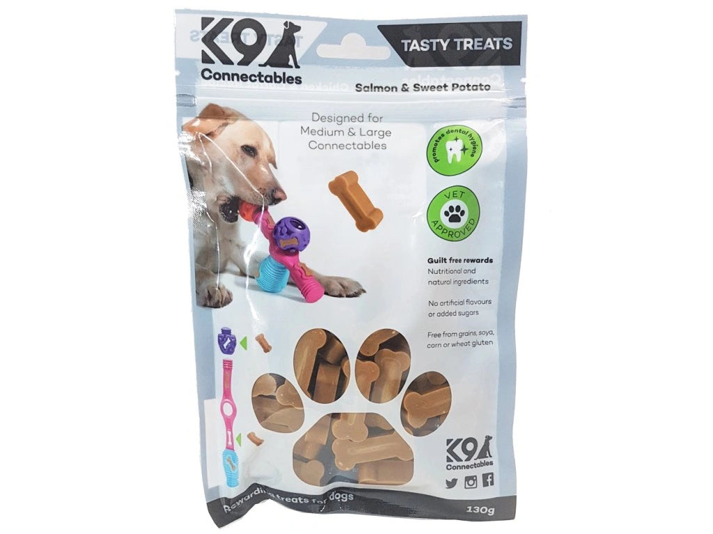 Špeciálne maškrty K9 Connectables s lososom a batátmi sú navrhnuté tak, aby presne zapadli do otvorov v hračkách K9 Connectables®. Nízkokalorické zloženie podporuje zdravie zubov a ďasien. K dispozícii sú dve veľkosti: menšie kosti pre malé hračky a väčšie kosti pre stredné a veľké hračky.