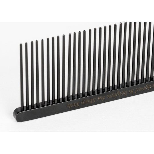 Profesionální antistatický hřeben Show Tech Greyhound Bronze je vyroben podle standardů ikonického Greyhound Comb. Díky teflonové povrchové úpravě minimalizuje tvorbu statické elektřiny, což usnadňuje česání a zabraňuje poletování chlupů. Kombinované rozložení zubů – jemná a širší část – umožňuje univerzální použití pro různé typy srsti.
